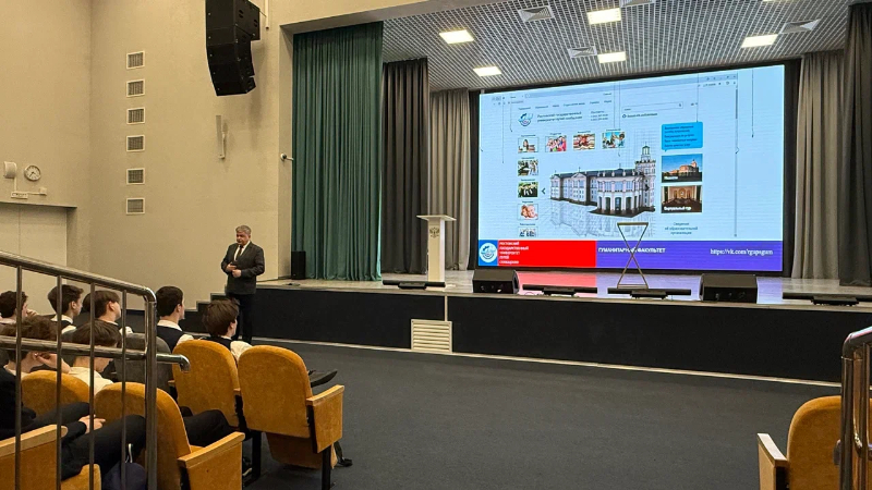 Осипов В.А. открыл перед старшеклассниками двери в мир гуманитарных наук: он поделился особенностями учебного процесса и представил направления подготовки на гуманитарном факультете.
