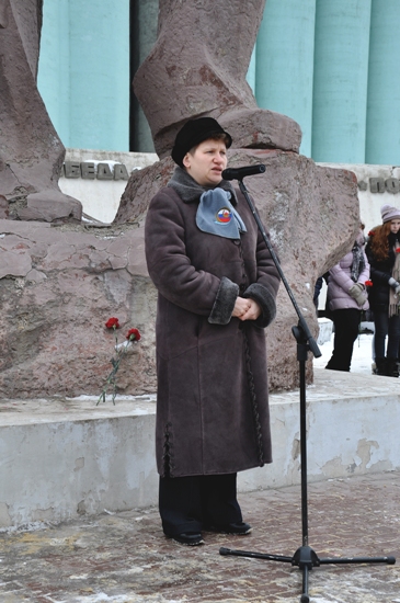 Митинг у памятника воинам-североморцам. Проректор по воспитательной работе и социальному развитию Е.Г. Шепилова.