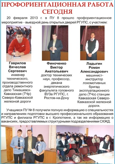 28 февраля в актовом зале филиала РГУПС в г. Кропоткине в рамках совместной профориентационной работы прошла встреча учащихся общеобразовательных школ №20 ст. Казанская и №14 ст. Кавказская с представителями производства структурных подразделений СКЖД.