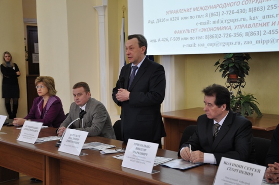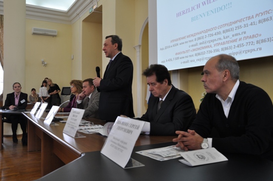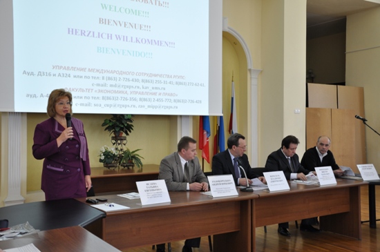 С приветственным словом к участникам встречи обратились: ректор ФГБОУ ВПО РГУПС В.Д. Верескун; начальник управления международного сотрудничества А.Ю. Голобородько; декан факультета «Экономика, управление и право» В.М. Приходько, заведующая кафедрой «Иностранные языки»Т.Е. Исаева, заведующий кафедрой «Экономика и менеджмент» С.Г. Шагинян.