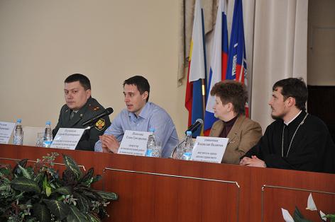 Открывая встречу, перед студентами выступил священник Владислав Паланчев, настоятель храма Святого Праведного Иоанна Кронштадтского, он обратился к студентам с призывом «Начни с себя!». Этот призыв означает: в бедах и неприятностях, которые случаются с тобой нужно искать причину в себе самом, и своём образе жизни. Да мир вокруг не так хорош, как хотелось бы. Много несправедливости, лжи, жестокости и соблазнов, но если каждый из нас не будет равнодушно проходить мимо, а постарается оградить себя, своих близких, да и всех людей от зла, то и мир станет чище и светлее, а сам человек счастливее.