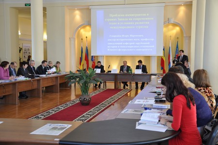 На пленарном заседании с докладами выступили: И.М. Узнародов д.и.н., профессор, зав. кафедрой Зарубежной истории и международных отношений ЮФУ; О.В. Ивлева д.г.н., профессор, зав. кафедрой Туризма ЮФУ; А.В. Бандурин д.э.н., профессор, проректор по научной работе МГИИТ; А.А. Демьянов д.э.н., генеральный директор ООО «Антарестрансавто»; В.В. Смеюха д.ф.н., профессор зав. кафедрой Массовые коммуникации и прикладная лингвистика РГУПС; Э.Н. Родина к.ф.н. специалист кафедры переподготовки по гостинично-ресторанному бизнесу и туризму Московской Академии предпринимательства при Правительстве Москвы ( Ростовский –на- Дону филиал).