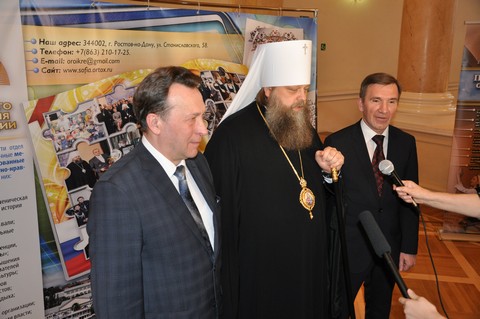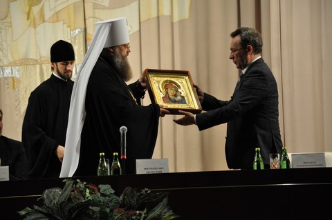 В дар университету Глава Донской митрополии митрополит Меркурий передал образ Божией Матери. Ректор Владимир Верескун преподнес владыке митрополиту памятный сувенир – символ вуза.