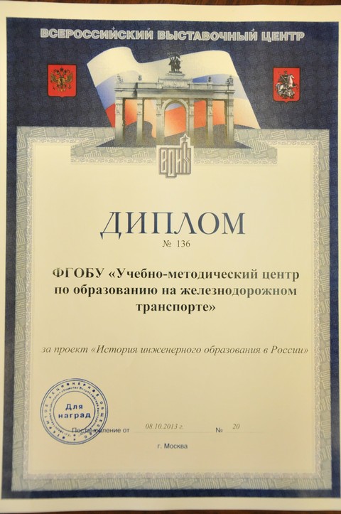 По результатам творческого конкурса научных разработок, инновационных решений и программ в области высшего профессионального образования в рамках XV Всероссийского форума «Образовательная среда – 2013», проходившего с 22 по 25 октября 2013 года в г. Москве, награждено дипломом ВВЦ №136 учебное пособие: «История инженерного образования в России» авторы: В.Д. Верескун, Ю.Д. Мишин, П.М. Постников.