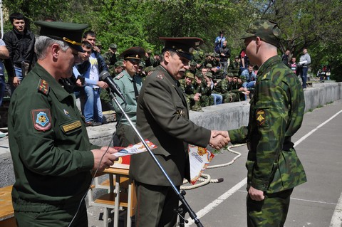 Победители соревнований были награждены грамотами. А от профсоюзного комитета студентов его председатель Д.А. Киселев вручил командам сладкие призы - огромные, специально на заказ изготовленные торты. Закрывая соревнования, начальник факультета военного обучения А.А. Хрусталев поблагодарил участников и выразил надежду, что в следующем году, году 70-летия Победы, студенты факультета вновь покажут высокое спортивное мастерство и упорство в достижении высоких результатов. Он же поздравил всех студентов с наступающим великим праздником - Днем Великой Победы нашего народа в Великой Отечественной войне.