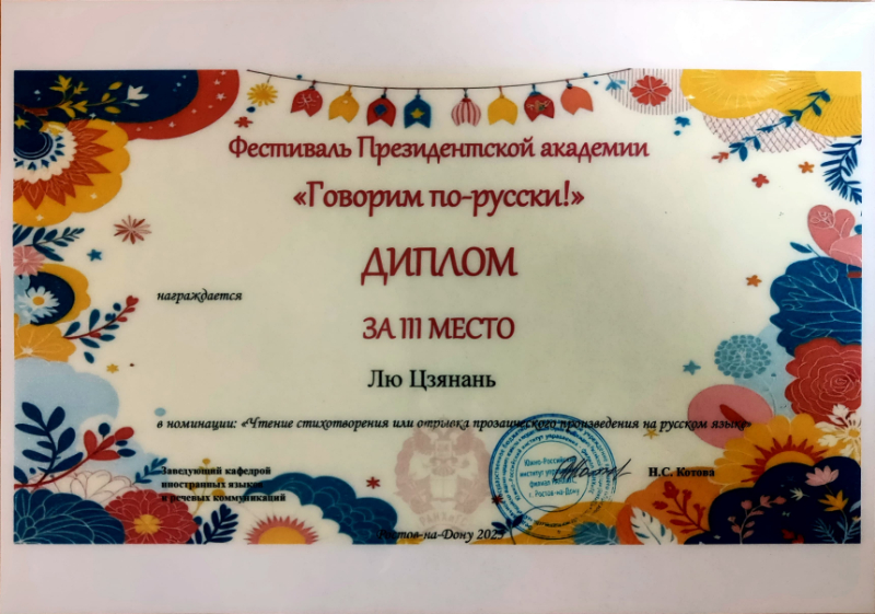 С гордостью сообщаем, что студентка нашего университета Лю Цзянань (Китай) стала призёром фестиваля Президентской академии «Говорим по-русски!». Она заняла 3 место в номинации «Чтение стихотворения или отрывка прозаического произведения на русском языке».