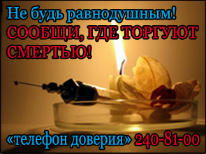 В рамках Акции по круглосуточному «телефону доверия» УФСКН России по Ростовской области (т. 240-81-00) жители г. Ростова-на-Дону и области могут оставлять свои предложения по повышению эффективности мер, направленных на предупреждение незаконного оборота и потребления наркотиков, предоставлять информацию о фактах незаконного оборота и потребления наркотических средств и психотропных веществ.