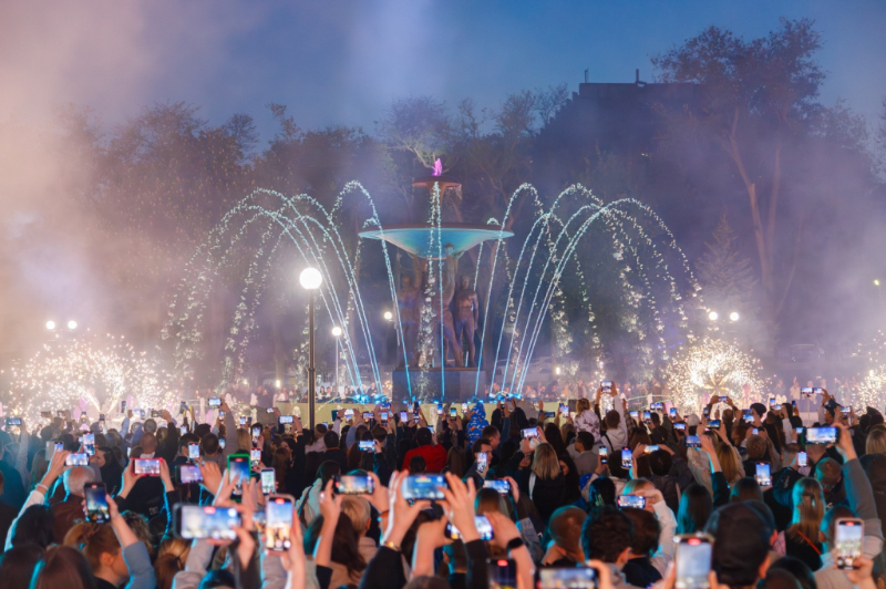 Открытие восстановленного фонтана состоялось вечером, чтобы присутствующие могли насладиться яркой подсветкой. Праздничную атмосферу подчеркивал концерт творческих коллективов Ростова, в том числе – выступление Народного эстрадного вокального ансамбля «Успех» РГУПС.