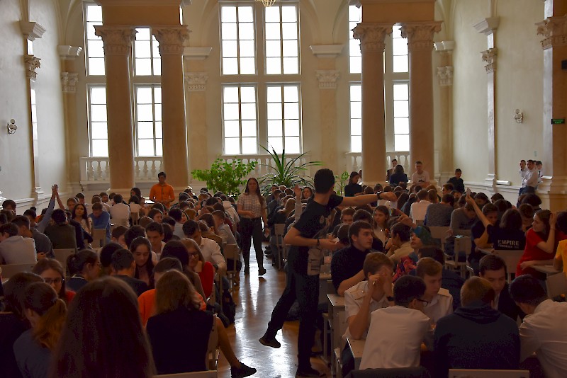 Атмосфера в холле актового зала в момент начала турнира была волнительной и торжественной, в момент звучания известных аккордов Штрауса, считающихся неофициальным гимном движения «Что? Где? Когда?», весь зал, не сговариваясь, встал.