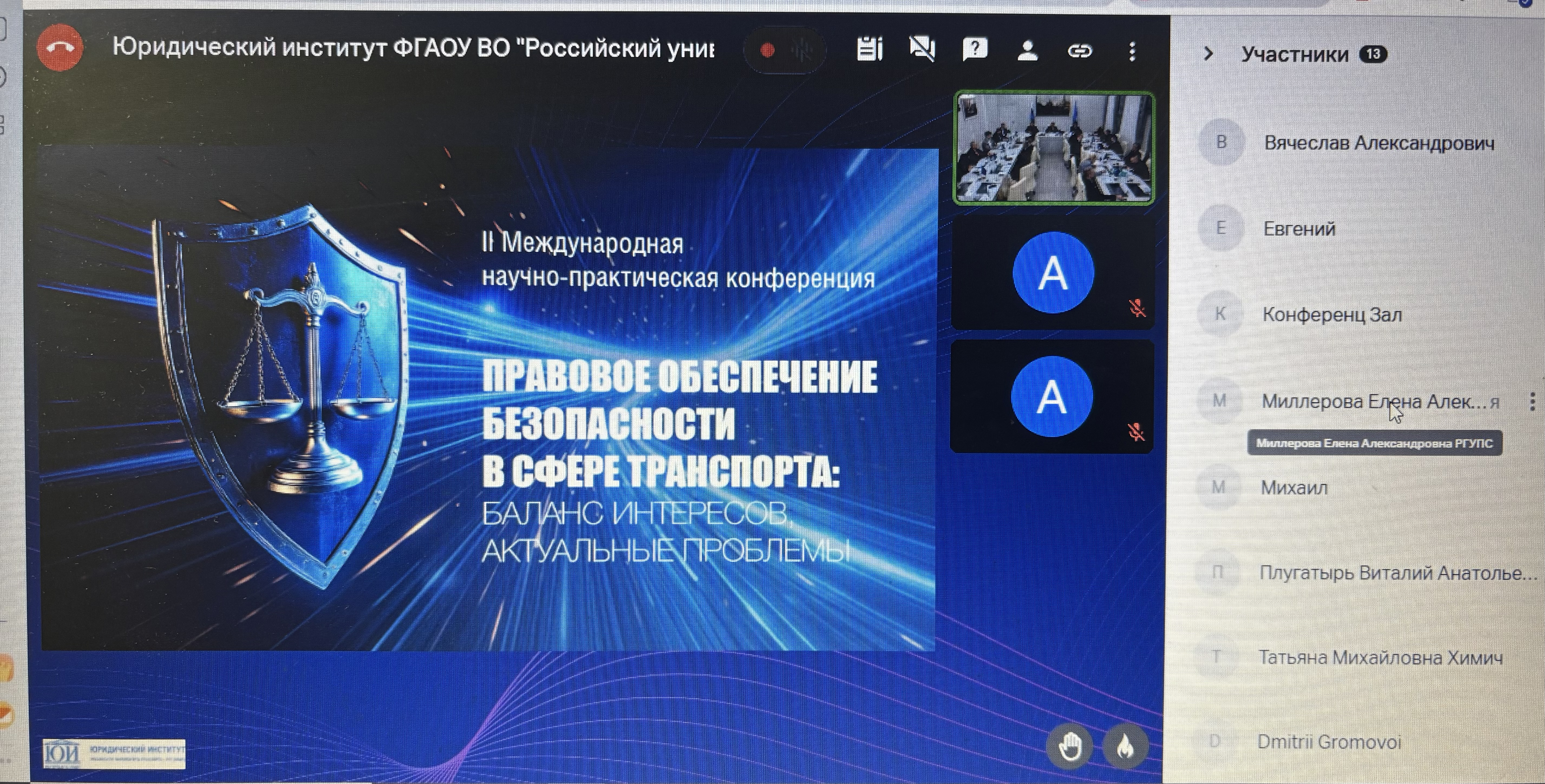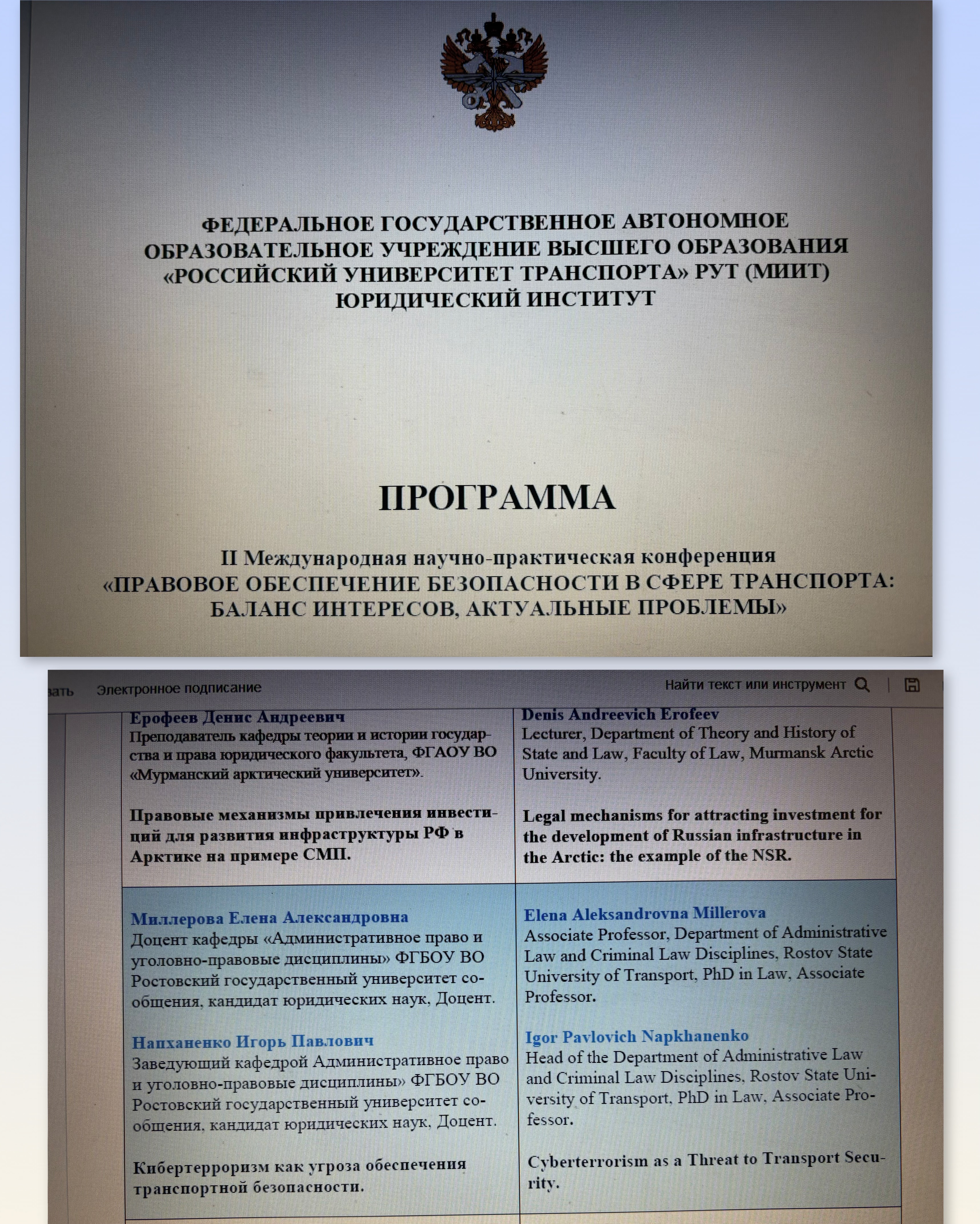 18 декабря 2025 года в Российском университете транспорта (МИИТ), г. Москва была проведена II Международная научно-практическая конференция «Правовое обеспечение безопасности в сфере транспорта: баланс интересов, актуальные проблемы», в которой приняли участие в онлайн формате сотрудники кафедры «Административное право и уголовно-правовые дисциплины» зав.кафедрой И.П. Напханенко и доцент кафедры Е.А. Миллерова выступив с докладом «Кибертерроризм как угроза обеспечения транспортной безопасности».