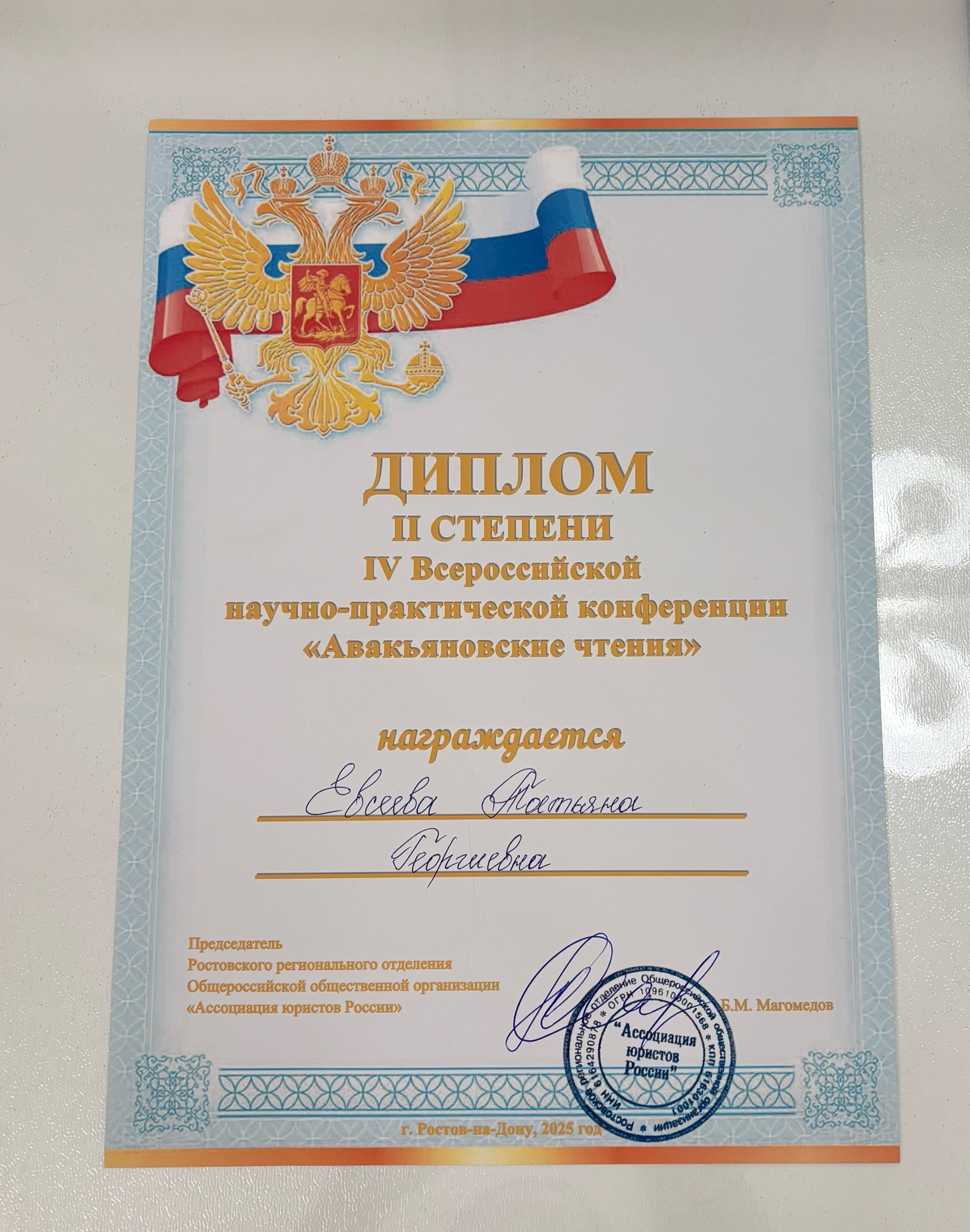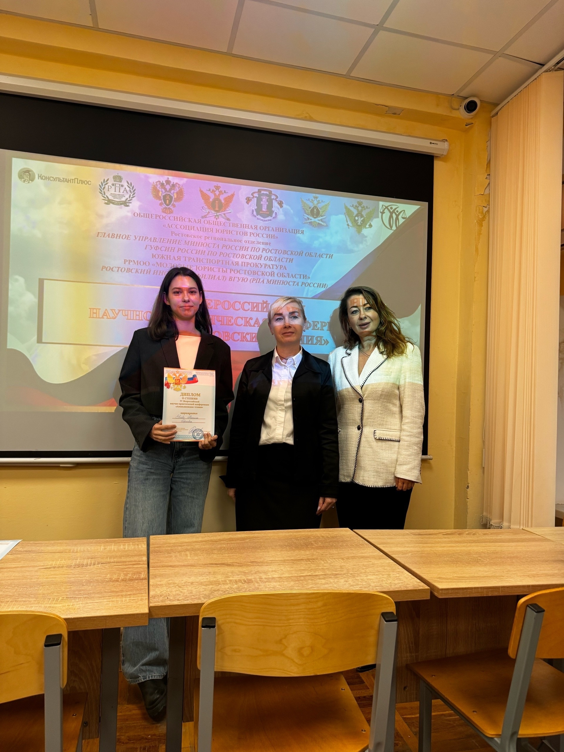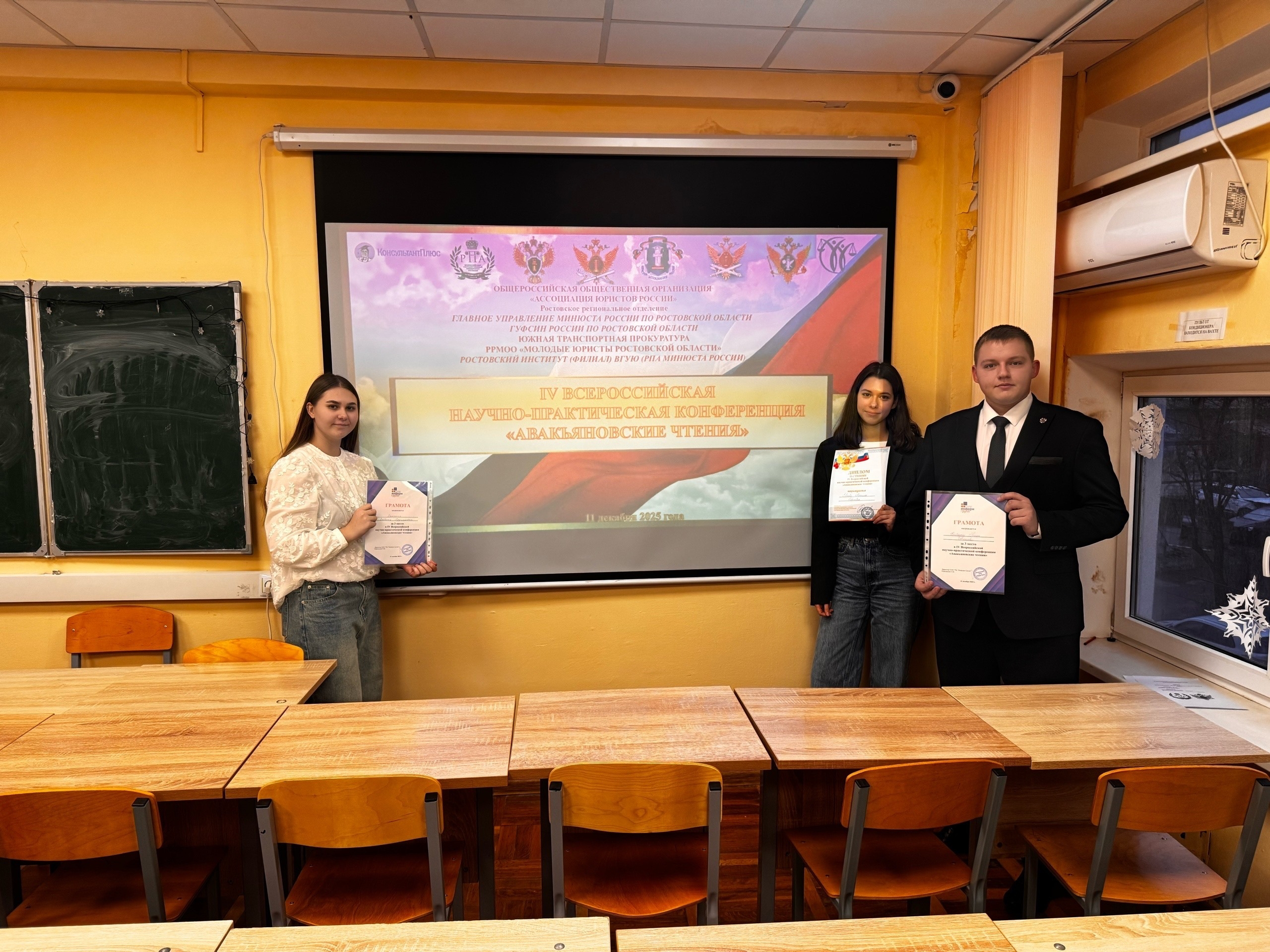 11 декабря 2025 г. в Ростовском институте (филиале) ФГБОУ ВО «Всероссийский государственный университет юстиции» при участии ГУ ФСИН, Ростовского регионального отделения Ассоциации юристов России, была проведена IV Всероссийская научно-практическая конференция «Авакьяновские чтения» в которой в очной форме приняли участие студенты направления подготовки Юриспруденция факультета ЭУП Евсеева Татьяна, Саяпина Сабина (ПУБ-2-34), Криворучко Роман (ПУБ-4-29).