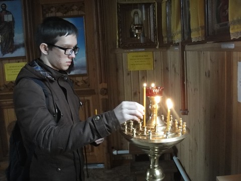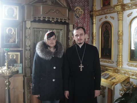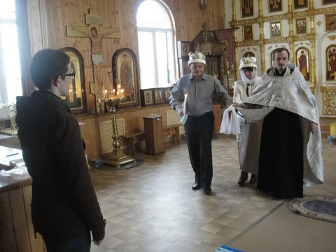 С большим участием к нашей миссии встречает нас отец Василий. С первых же минут это святое место раскрыло себя, и мы смогли ощутить всю силу, исходящую от него. Перед нами открылся занавес на великое таинство венчания: жениху и невесте вручены священником зажжённые свечи как знак пламенной и чистой любви, которую отныне они должны питать друг к другу («Это знак целомудрия и пребывающей благодати Божией» - после таинства поясняет отец Василий). Диакон произносит различные моления, в том числе о брачующихся от лица всех присутствующих в храме (включая нас, конечно), сквозь которые мы слышим пожелание благословенного рождения детей.
