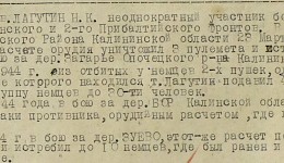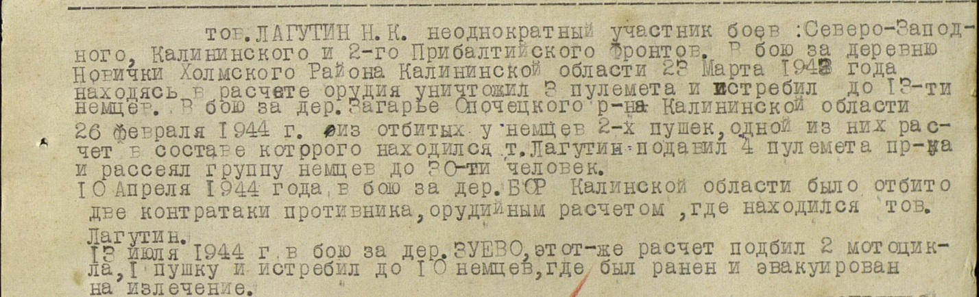 Пролечившись в госпитале, Николай Кириллович снова отправляется на фронт. И вновь он попадает в самое «пекло». Бой за деревню Новички Хомского района Калининской области 24 марта 1943г. Оборона противника не была сплошной, немцы занимали позиции, подготавливая их для круговой обороны и превращая в опорные пункты. Каждую деревню враг старался укрепить с тактическим мастерством. Каждый метр пространства простреливался из многочисленных пулемётов, орудий, притаившихся в деревнях. Наши советские солдаты понимали, что враг силён, поэтому приходилось рассчитывать на манёвр, смекалку, использовать незанятые промежутки. На войне как на войне… Дедушка находится в расчёте орудия. Холод, грязь, бесконечная канонада. И гвардии рядовой Лагутин совершает очередной подвиг: он уничтожает 3 пулемёта и истребляет 13 немцев.