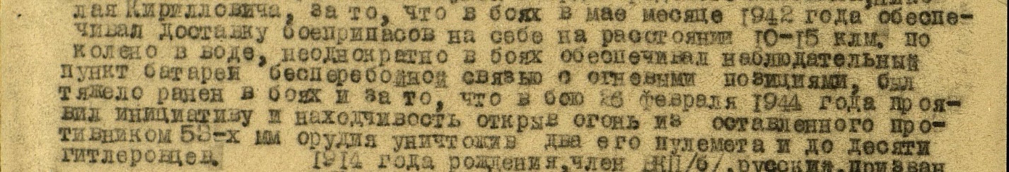 Первую награду - медаль «За отвагу» прадедушка получил, когда участвовал в общем наступлении под Москвой. В мае 1942 года Николай Кириллович обеспечивал доставку боеприпасов в тяжёлых условиях по колено в воде на расстоянии 10-15 км. Неоднократно в боях он обеспечивал наблюдательный пункт батареи бесперебойной связью с огневыми позициями, хотя сам дедушка был тяжело ранен в спину.