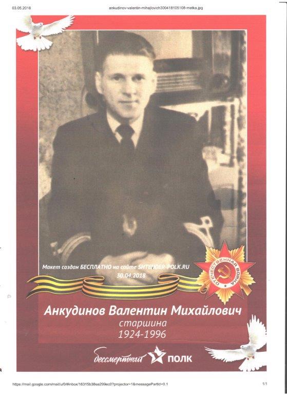 Мой прадедушка, Анкудинов Валентин Михайлович,18 февраля 1924 года рождения. Родился в Архангельской области. Получил образование в Архангельском механическом техникуме.