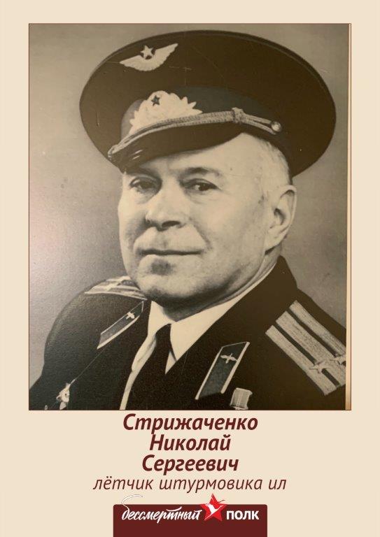 Прадедушка Стрижаченко Николай Сергеевич родился в 1923 году в селе Успенка Луганской области. Летчик штурмовика ИЛ-2 3-го Украинского фронта, Прибалтийского фронта. В результате штурмовых и бомбовых ударов самолета прадедушки были уничтожены вражеские танки, бронетранспортеры, артиллерийские орудия, автомашины, железнодорожные вагоны. Награжден двумя орденами Красного Знамени, орденом Красной звезды, орденом Отечественной войны II и медалью «За Боевые Заслуги». Участник Парада Победы в Москве 1945г.!