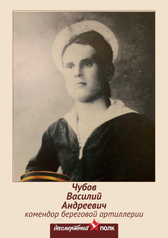Прадедушка Чубов Василий Андреевич родился в 1919 году. Участник Советско-Финской войны. Во время Великой Отечественной войны служил Комендором береговой артиллерии батареи №8 70 ОАД (отдельного артиллерийского дивизиона) Иоканской военной морской базы Северного флота г. Мурманск. Награжден орденом Отечественной войны II и медалью «За Боевые Заслуги».