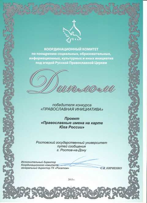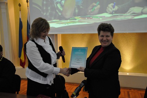 Прозвучало много благодарных слов, подводивших итоги работы по реализации проекта и новым планам сотрудничества. Представитель Ростовской-на-Дону и Новочеркасской Епархии вручили Елене Григорьевне Шепиловой диплом победителя конкурса «Православная инициатива», выданный университету Координационным комитетом по поощрению социальных, образовательных, информационных, культурных и иных инициатив под эгидой Русской Православной Церкви.