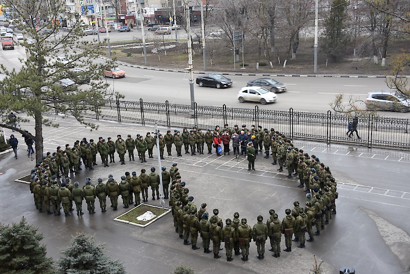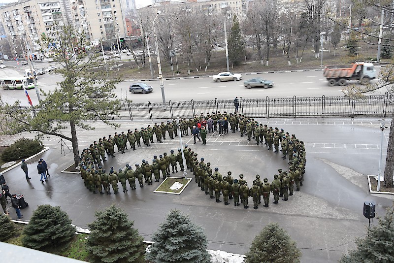 На военном плацу студенты – более 600 человек выстроились в виде «Сердца», олицетворяя любовь к своей Родине. Защита Отечества с оружием в руках в нашей истории всегда было почетным и многотрудным делом, традицией нашего народа. Героическое его прошлое создало неувядаемые традиции мужества, доблести и любви к Родине.