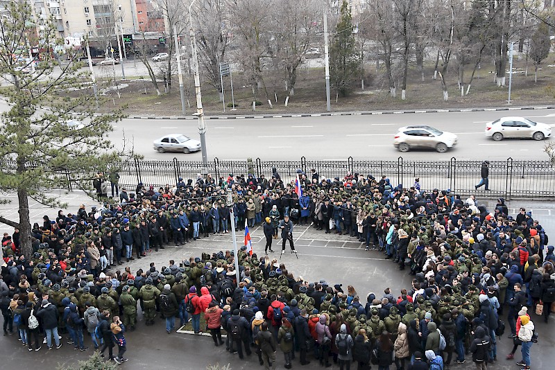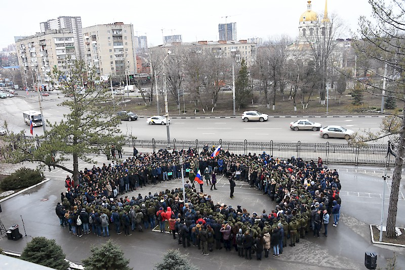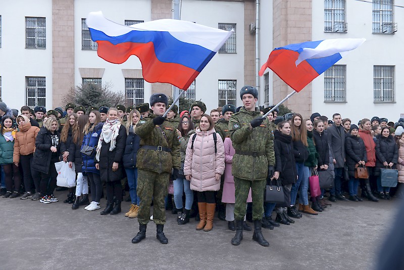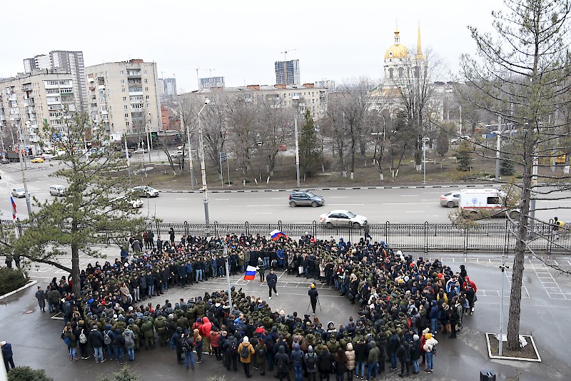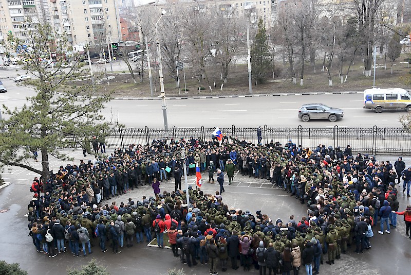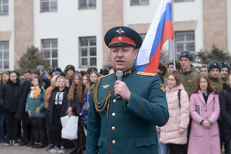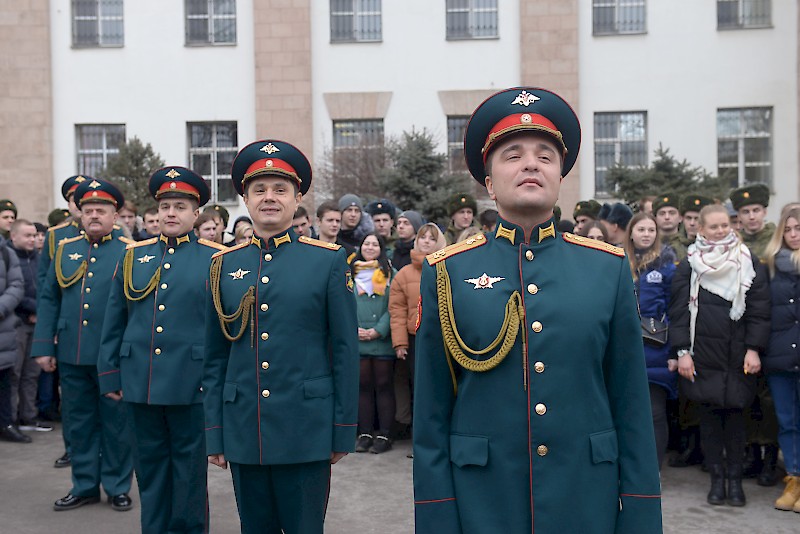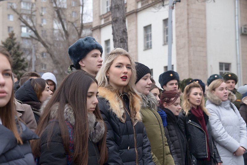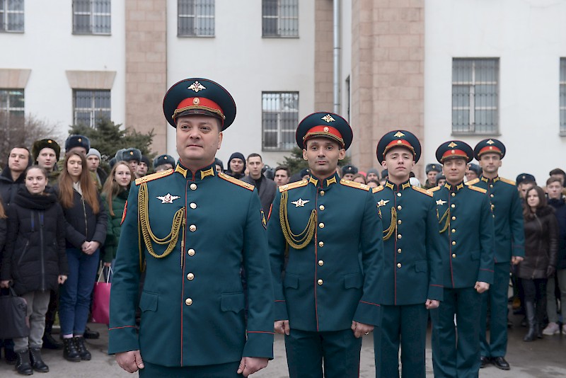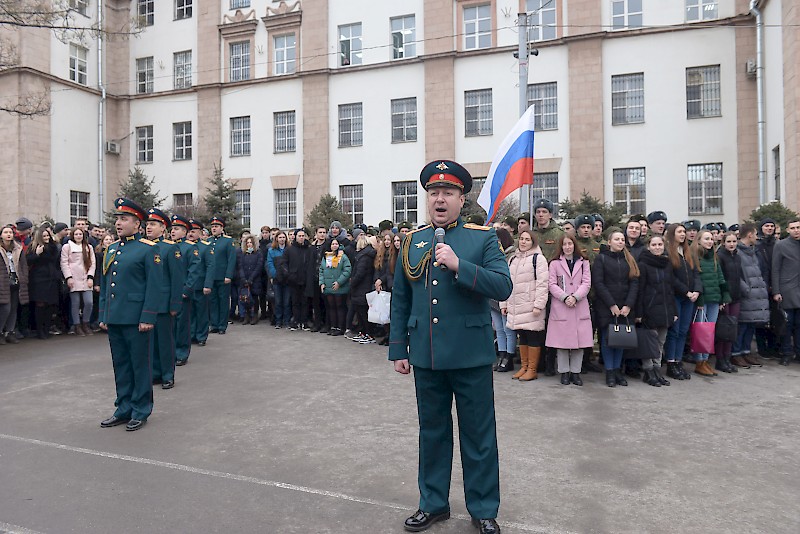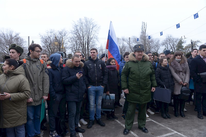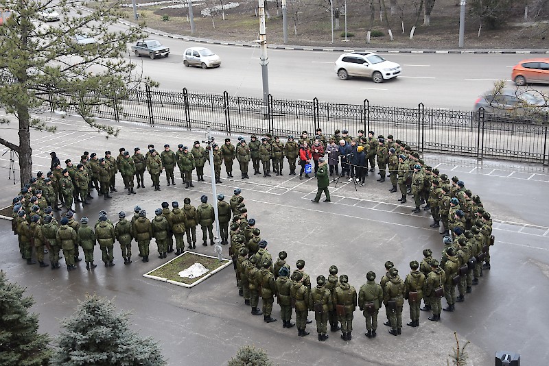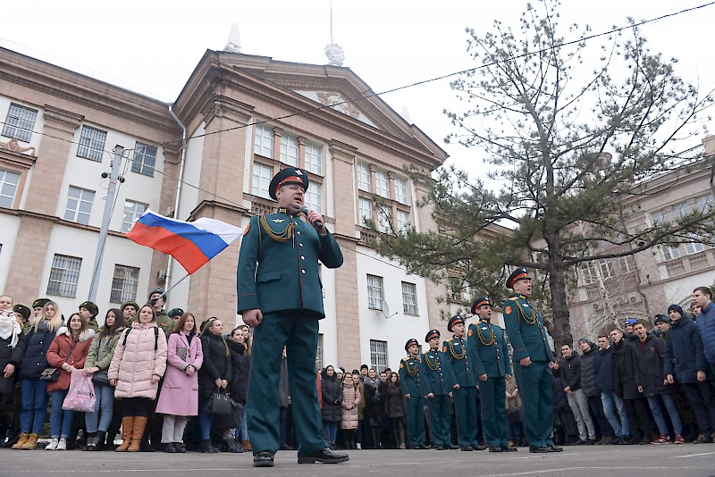 Студенты Военного учебного центра, студенты факультетов, преподаватели, офицеры ВУЦ совместно с ансамбль песни и пляски Южного военного округа, художественный руководитель, начальник ансамбля, заслуженный работник культуры РФ Игорь Марченко поздравили ветеранов, офицеров, студентов , преподавателей и горожан с Днем защитника Отечества, хором исполнив песню «Служить России».