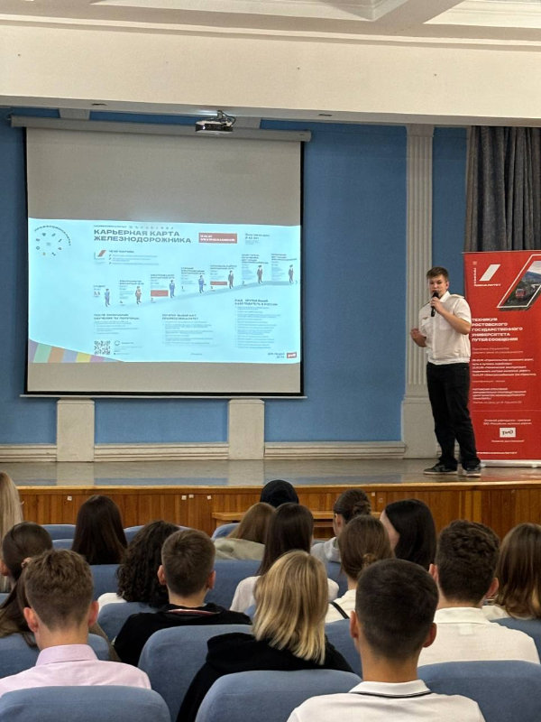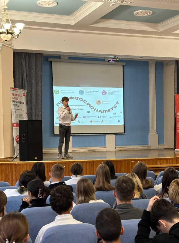 Амбассадоры Профессионалитета презентовали Ростовский отраслевой образовательно-производственный кластер железнодорожного транспорта, рассказали о том, чем занимается команда студентов техникума «Амбассадоры Профессионалитета», представили основного партнера проекта – компанию «Российские железные дороги» и карьерные карты железнодорожников, отражающие профессиональный рост выпускника техникума.
