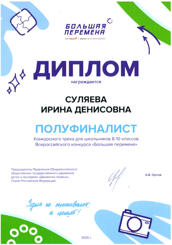 В начале сентября ученица 11Г Суляева Ирина приняла участие в полуфинале федерального проекта «Большая перемена», который проходил в Анапском районе Краснодарского края во Всероссийском детском центре «Смена». «Это был один из самых ярких и продуктивных периодов в моей жизни, ˗ рассказывает Ирина.  Полуфинал ˗ это не просто конкурс, это настоящая школа жизни. Мы погрузились в насыщенную конкурсную программу: работали над проектами в командах, посещали мастер-классы от экспертов, учились креативно мыслить и презентовать свои идеи. Самое ценное для меня ˗ это новые знакомства, я познакомилась с талантливыми и целеустремленными ребятами со всей страны».