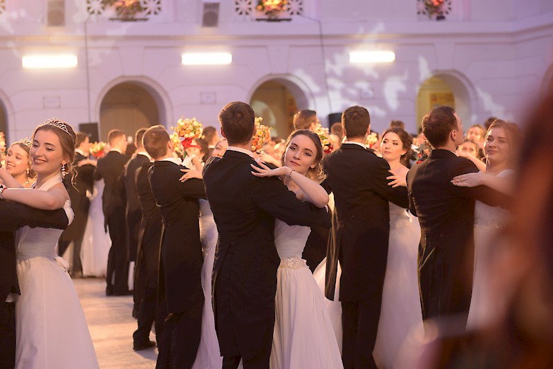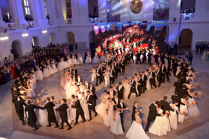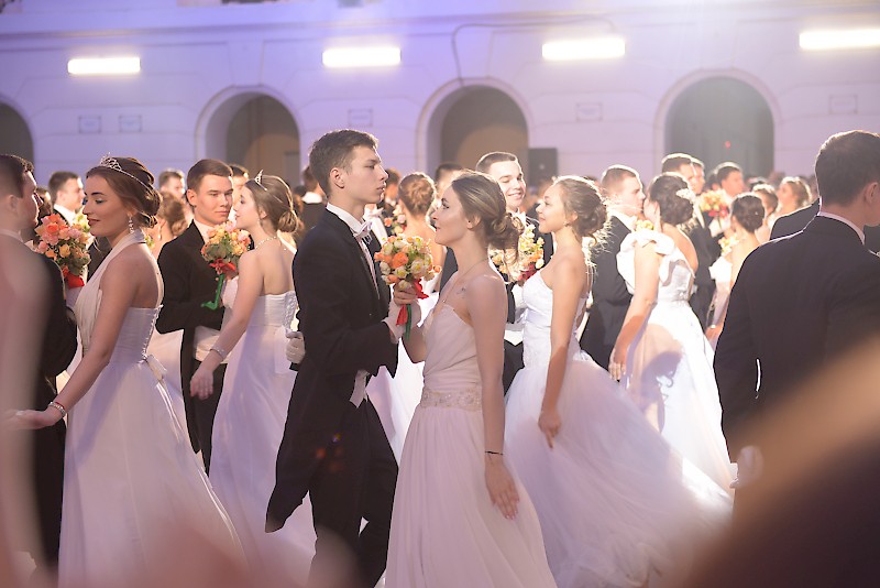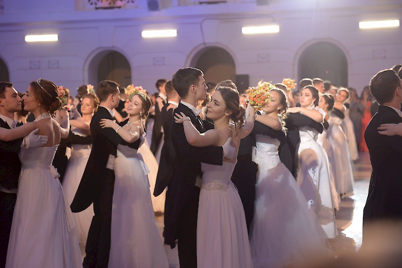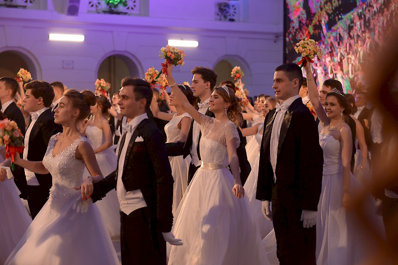Элегантные юноши и очаровательные девушки в красивых нарядах кружили в вальсе и танцевали польку в лучших традициях балов.