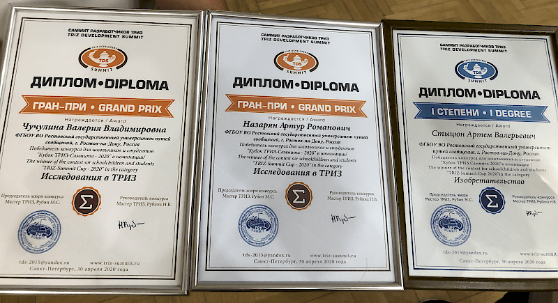 По итогам конкурса Назарян А.Р. и Чучулина В.В. взяли Гран-при в своей номинации и были награждены дипломами и кубком ТРИЗ-Саммита, а Стыцюн А.В. занял первое место в своей номинации и награждён дипломом первой степени. Поздравляем наших победителей и