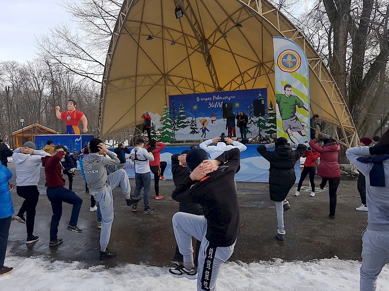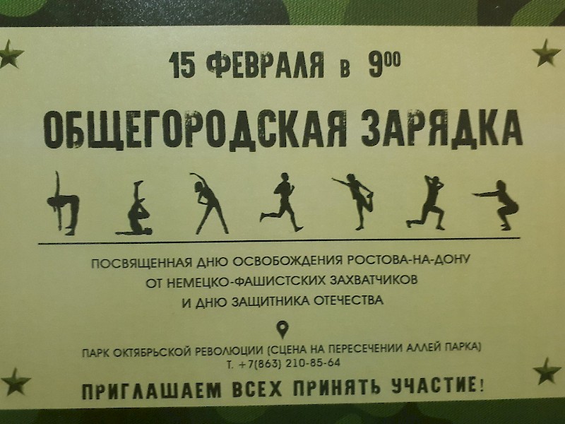 15 февраля г. Ростове-на-Дону прошла "Общегородская зарядка", посвященная дню освобождения города от немецко-фашистских захватчиков и предстоящему Дню защитника Отечества. Разминку, зарядку с элементами бокса и пробежку провели инструкторы ЦФКС.