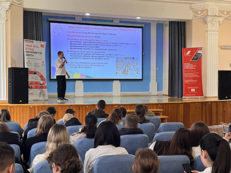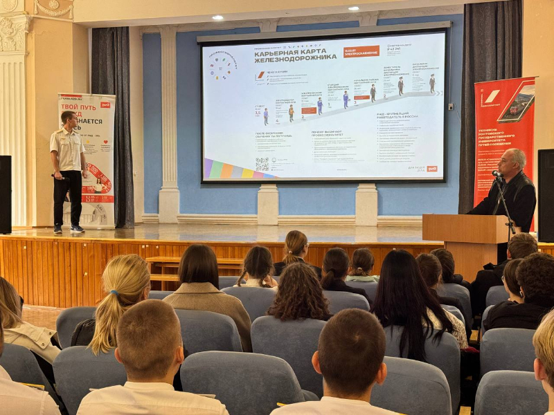 17 октября амбассадоры Профессионалитета в актовом зале техникума для 120 обучающихся лицея № 14 города Ростова-на-Дону презентовали Ростовский отраслевой образовательно-производственный кластер железнодорожного транспорта, рассказали о том, чем занимается команда студентов техникума «Амбассадоры Профессионалитета», представили основного партнера проекта – компанию «Российские железные дороги» и карьерные карты железнодорожников, отражающие профессиональный рост выпускника техникума.