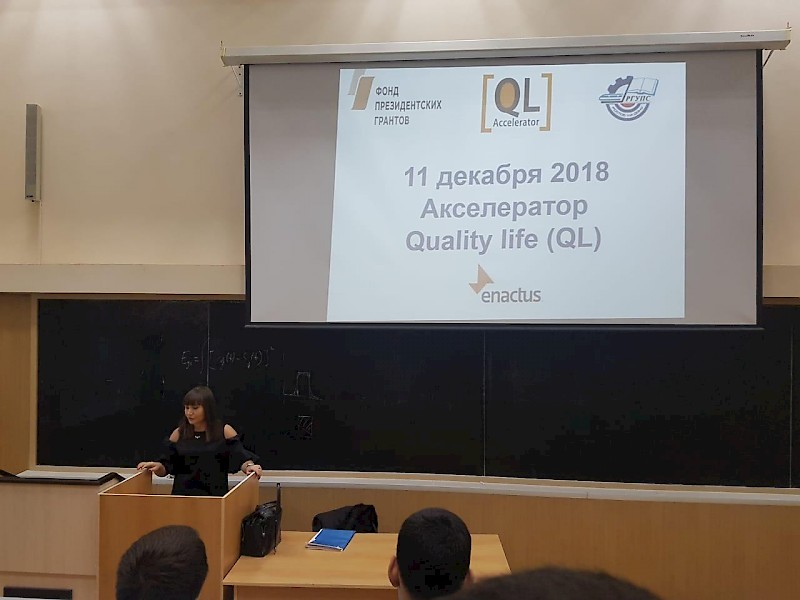 Проект «Акселератор Quality life (QL)» выполняется с использованием гранта Президента Российской Федерации на развитие гражданского общества, предоставленного Фондом президентских грантов. Студенты факультета «Экономика, управление и право» в октябре 2018 года приняли активное участие в официальном открытии программы Enactus".