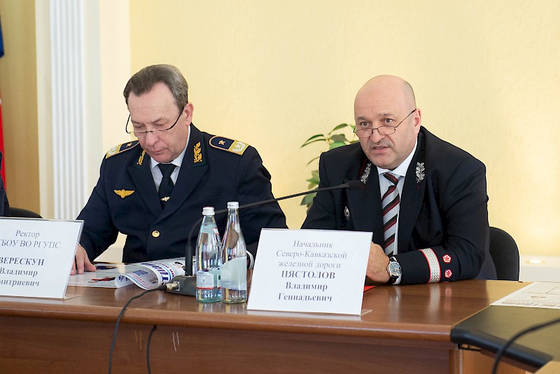 Президиум собрания: ректор д.т.н., профессор В.Д. Верескун, начальник СКЖД-филиала ОАО «РЖД» В.Г. Пястолов, первый проректор к.т.н., профессор А.В. Челохьян, президент РГУПС, академик РАН В.И. Колесников, проректор по научной работе , д.т.н., профессор А.Н. Гуда.
