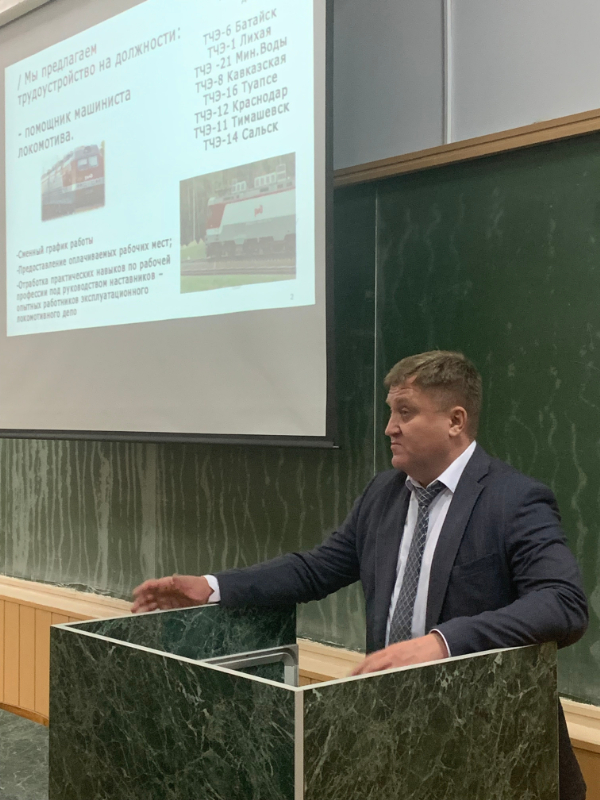 Перед студентами выступили: начальник Северо-Кавказской дирекции тяги Алексей Юрьевич Кулагин, первый заместитель Андрей Павлович Тенищев, заместитель начальника дирекции по кадрам и социальным вопросам Вадим Сергеевич Петряков, и.о. заместителя начальника эксплуатационного локомотивного депо Батайск по кадрам Евгения Алексеевна Романова, ведущий специалист управления персоналом отдела по подбору персонала Наталия Петровна Колоскова.