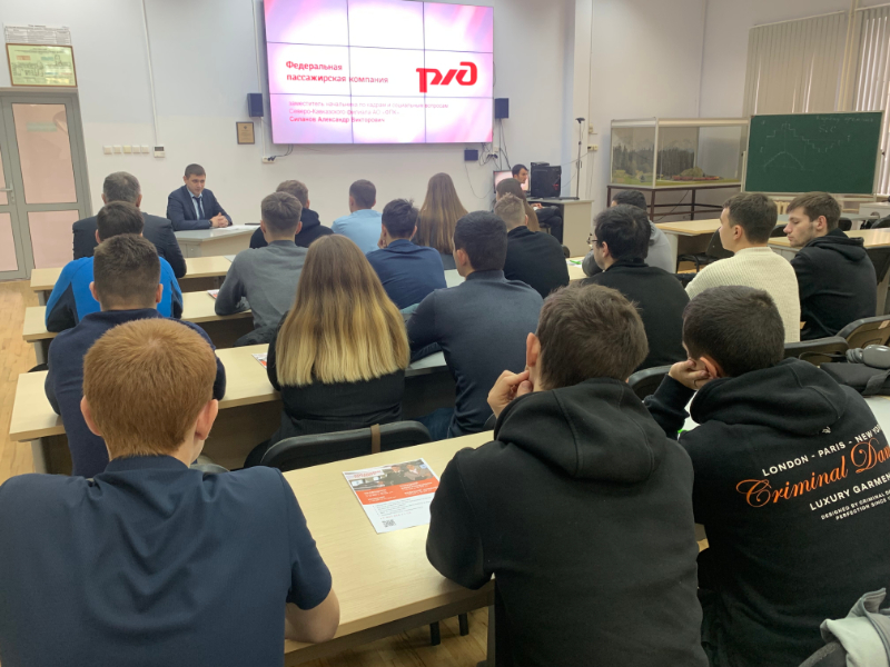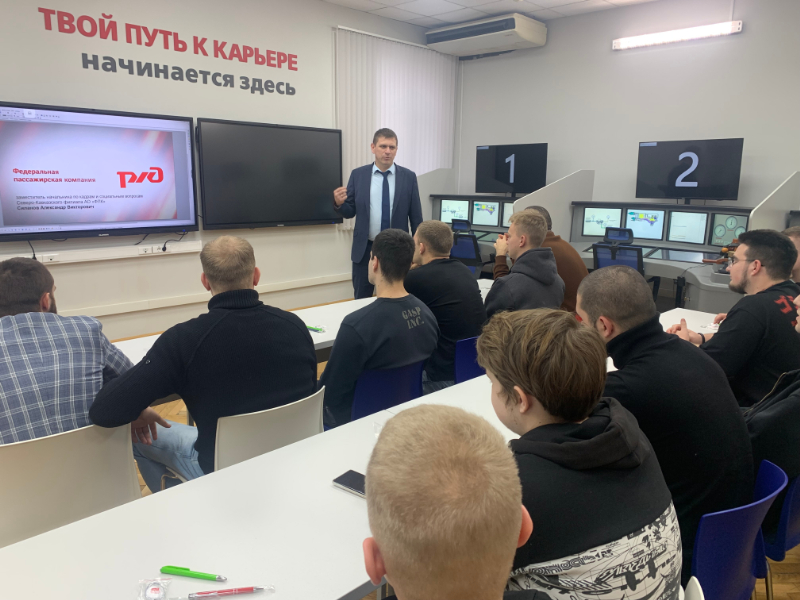 В ходе встречи Александр Викторович продемонстрировал информационный материал и подробно рассказал о структуре и подразделениях филиала, эксплуатируемом подвижном составе и новых перспективных направлениях развития компании в будущем. Также предоставил студентам информацию об объемном социальном пакете, предоставляемом работникам компании, имеющихся вакансиях, перспективах карьерного роста и ответил на интересующие вопросы.